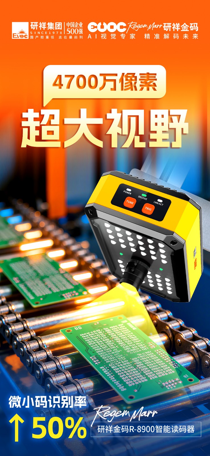 作为行业首款4700万像素的智能读码器,星空电竞R-8900单次识读即可覆盖500+条码,视野范围高达常规读码器的25倍。